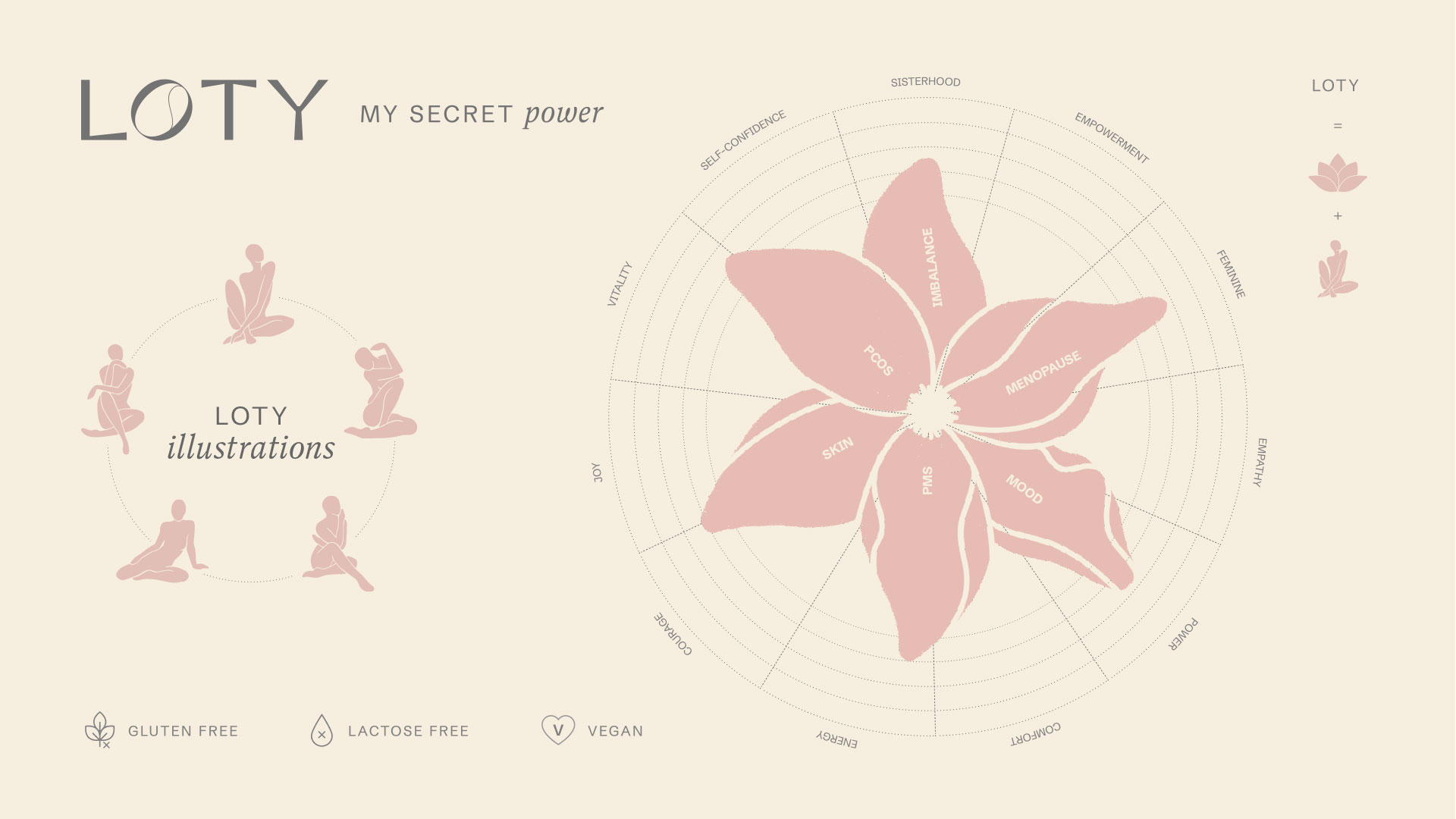LOTY je linija prehranskih dodatkovza za ženske, zasnovanih z osredotočenostjo na pogosto spregledane zdravstvene izzive, kot so menopavza, PCOS in hormonsko neravnovesje. Z naravnimi formulami in jasno sporočilnostjo blagovna znamka spodbuja ženske, da prevzamejo nadzor nad svojim telesom in zdravjem.