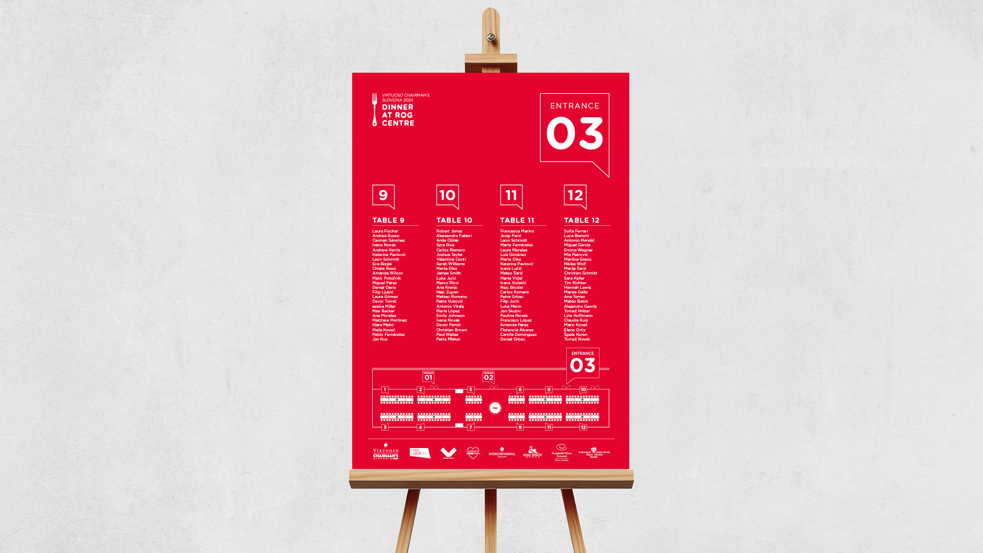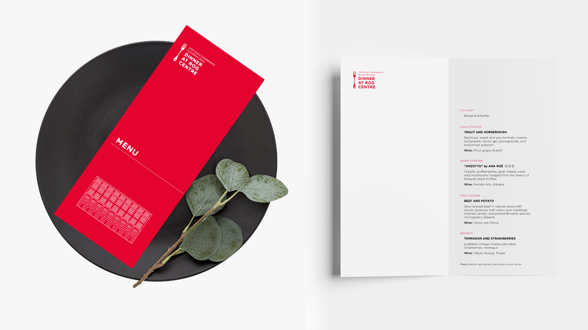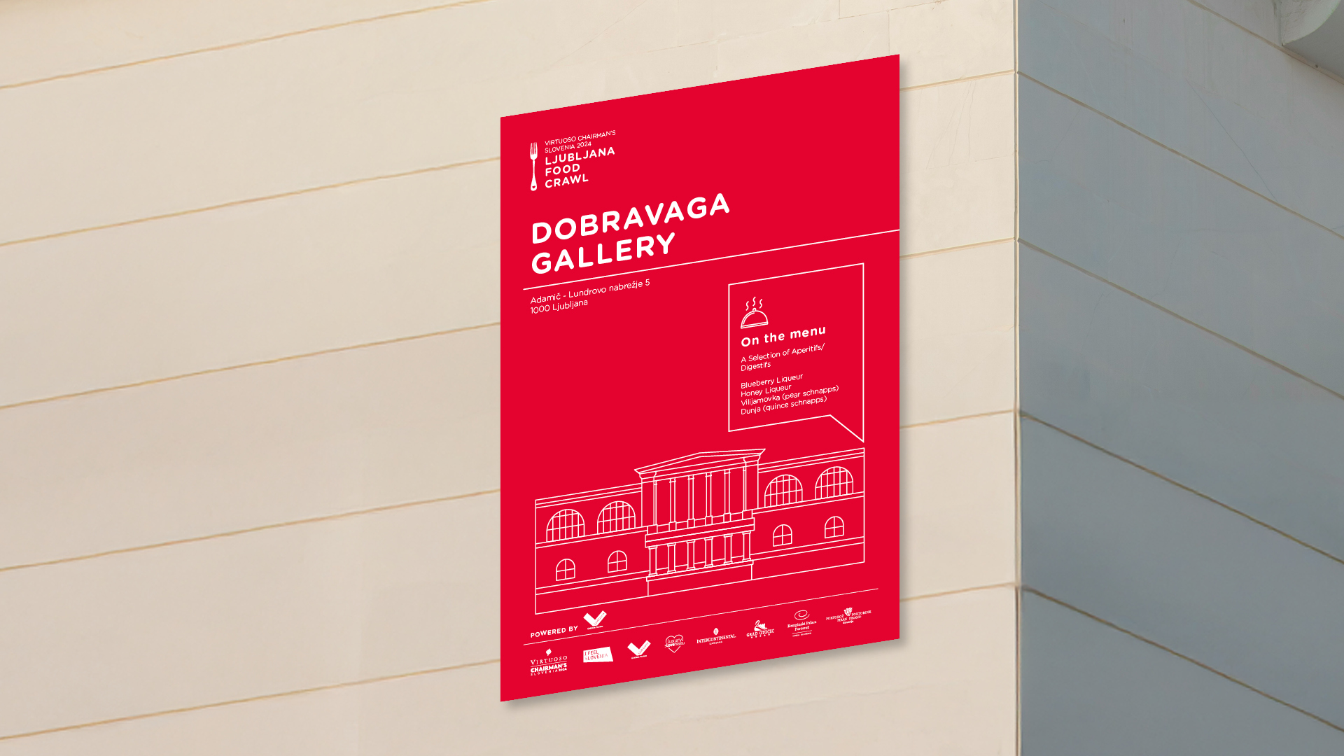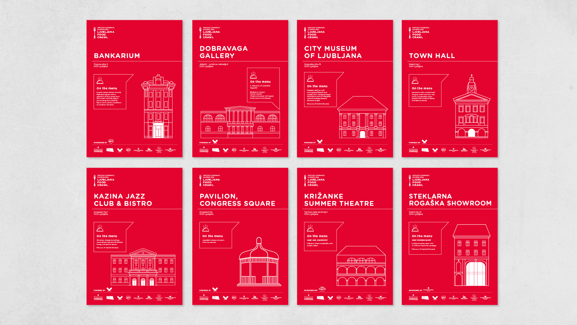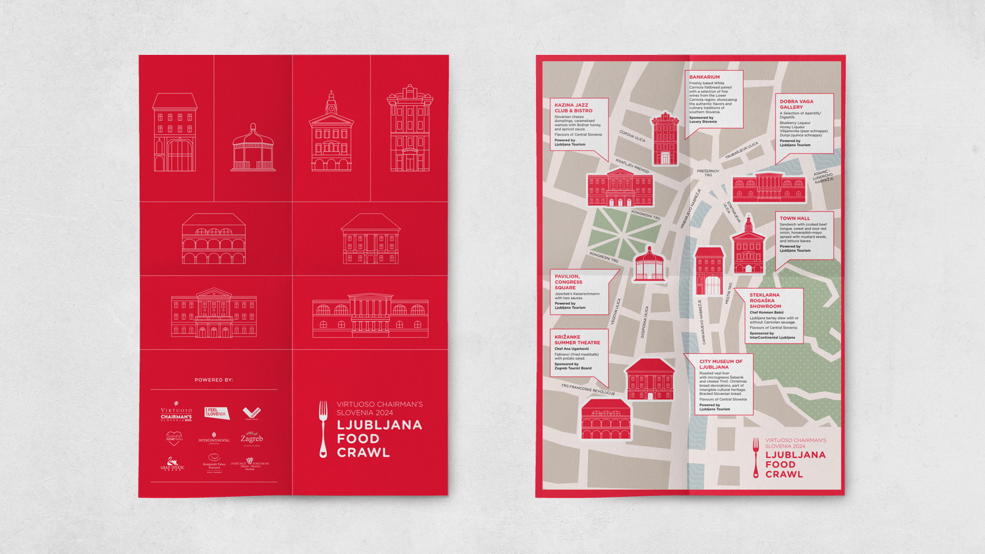 Ljubljana je postala tako prizorišče kot tudi pripoved. Vizualno podobo smo gradili na duhu Ljubljane – na njeni arhitekturi, kulinariki in zgodbah, ki jih mesto nosi skozi čas. Za Food Crawl smo pripravili ročno ilustrirane podobe posameznih prizorišč okušanja ter oblikovali zemljevid, označbe in menije. Zaključno gala večerjo v Centru Rog so dopolnili prefinjeni tiskani materiali in strukturiran sedežni red, skladni z elegantnim tonom dogodka.
